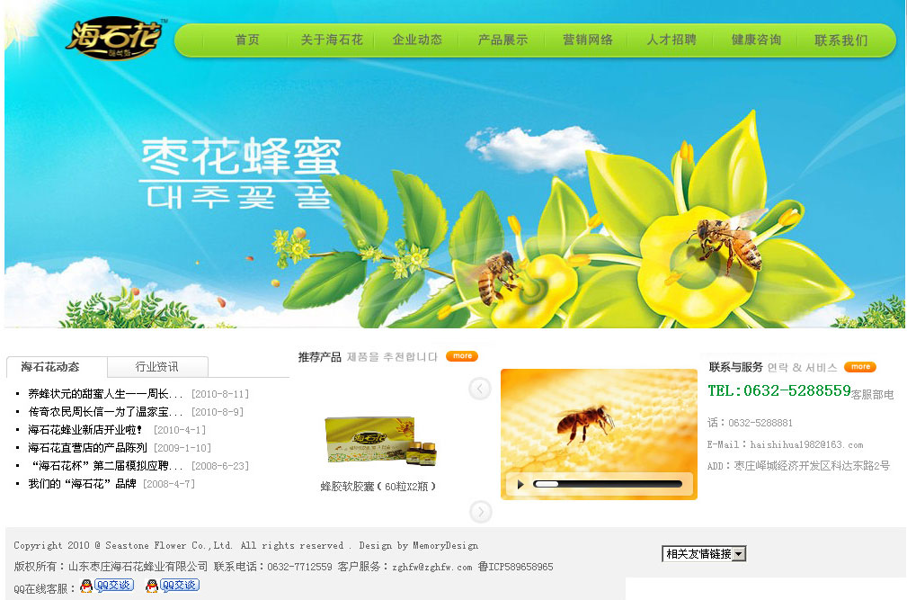 (韓國獨資)棗莊市海石花蜂業(yè)有限公司 海石花蜂業(yè)有限公司始創(chuàng)于1982年7月,座落在舉世聞名的冠世榴園腹地,這里群山起伏,榴花似火,蜜蜂翩翩飛舞,風(fēng)景秀麗。 海石花蜂業(yè)是一家集養(yǎng)蜂、蜂產(chǎn)品深加工科貿(mào)為一體化的出口型企業(yè),產(chǎn)品出口日本、韓國、加拿大等諸多國家。公司現(xiàn)有四大養(yǎng)蜂基地:中國冠世榴園生態(tài)養(yǎng)蜂基地、云南西雙版納生態(tài)養(yǎng)蜂基地、黃山藥谷養(yǎng)蜂基地、山海關(guān)范家鎮(zhèn)有機蜂產(chǎn)品基地.充足的蜜源保證了產(chǎn)品更純、更鮮的特點。海石花企業(yè)擁有多項行業(yè)領(lǐng)先的技術(shù),所有產(chǎn)品均通過HACCP食品安全管理體系認(rèn)證、綠色食品認(rèn)證、有機食品認(rèn)證等. 公司總經(jīng)理周長信曾先后兩次在人民大會堂受到國家總理溫家寶、國家副總理回良玉的親切接見,被譽為中國養(yǎng)蜂狀元.現(xiàn)任中國蜂協(xié)理事,市政協(xié)常委委員. 由著名導(dǎo)演張惠中執(zhí)導(dǎo),張繼編劇的電視連續(xù)劇《石榴花開》中海石花蜂業(yè)系列蜂產(chǎn)品有多次不同角度的呈現(xiàn),《石榴花開》的許多劇情都是在海石花公司、海石花養(yǎng)蜂基地拍攝的,首播已在陜西綜藝臺等地方電視臺陸續(xù)開播,隨后各地方衛(wèi)視都將全面播出。 公司不斷發(fā)展壯大,形成了集海石花蜂業(yè)養(yǎng)蜂基地、海石花蜂業(yè)生產(chǎn)基地為一體的現(xiàn)代化、規(guī);某隹谛推髽I(yè),成為國內(nèi)同行業(yè)中的佼佼者。 海石花蜂業(yè)有限公司技術(shù)力量雄厚,產(chǎn)品已發(fā)展為六大系列、100多個單品,產(chǎn)品出口日本、韓國、加拿大等諸多國家。 棗莊網(wǎng)站制作 |