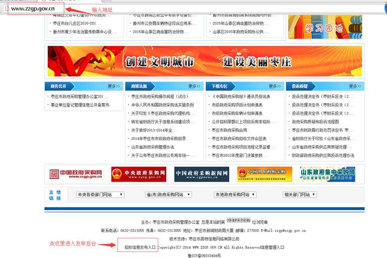 1、 登陸棗莊市政府采購網(wǎng)地址:http://www.zzgp.gov.cn/ 拉到網(wǎng)頁下邊: